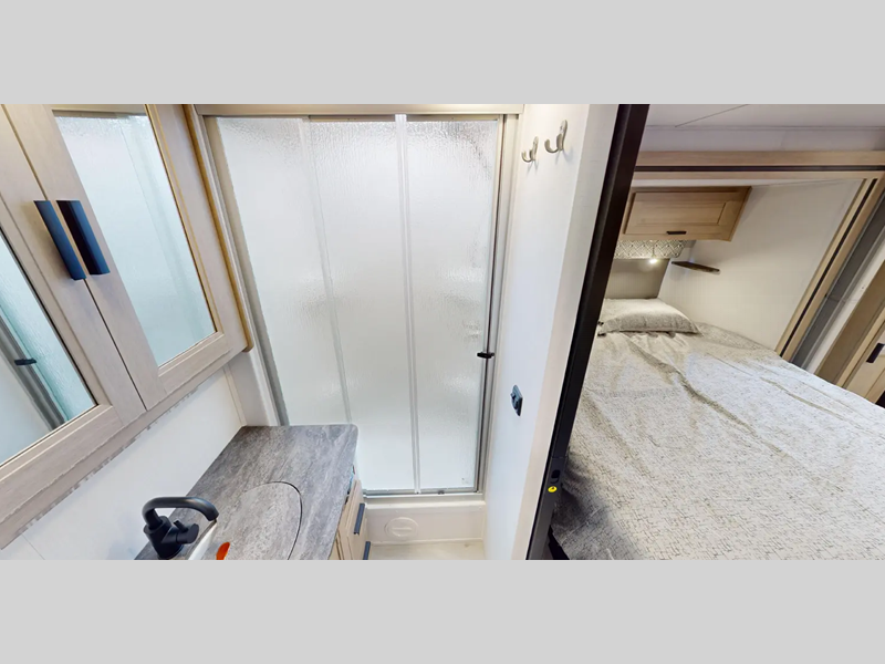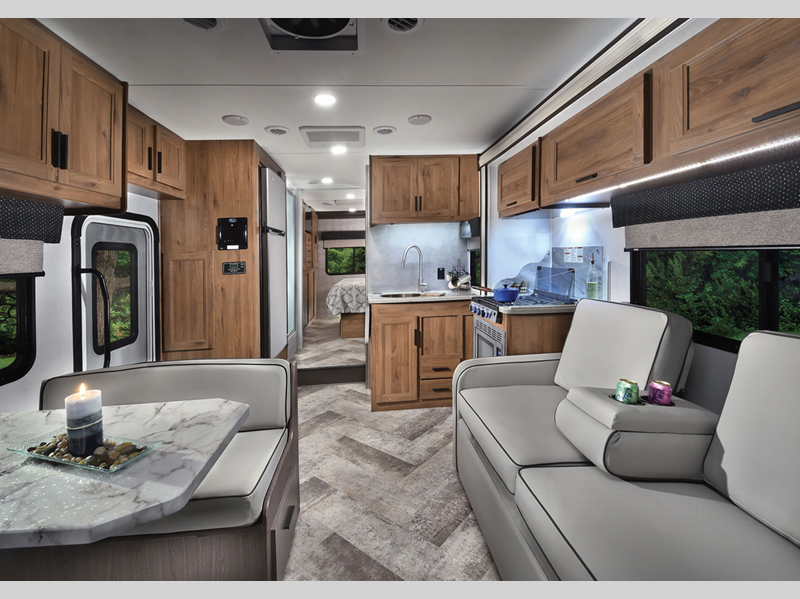 Each model includes an EZ Ryde upgraded suspension system for a smooth drive each time, plus a 10" touch screen and backup camera/side view cameras with a 3-way monitor for easy maneuvering at the campground. The 2" aluminum framed laminated sidewalls and SuperLite composite substrate provide a strong motorhome made to last, and the block foam insulation means you can camp year around. Head inside to find black out roller shades, soft touch self-closing drawer guides, an oxygen-infused shower head, plus a 12V USB charging station to keep your electronics charged and ready to go.